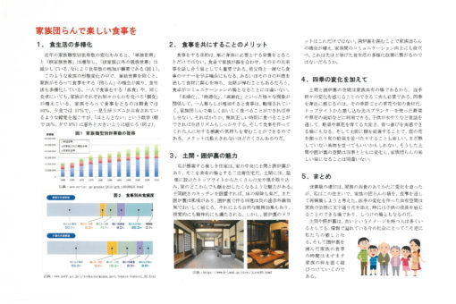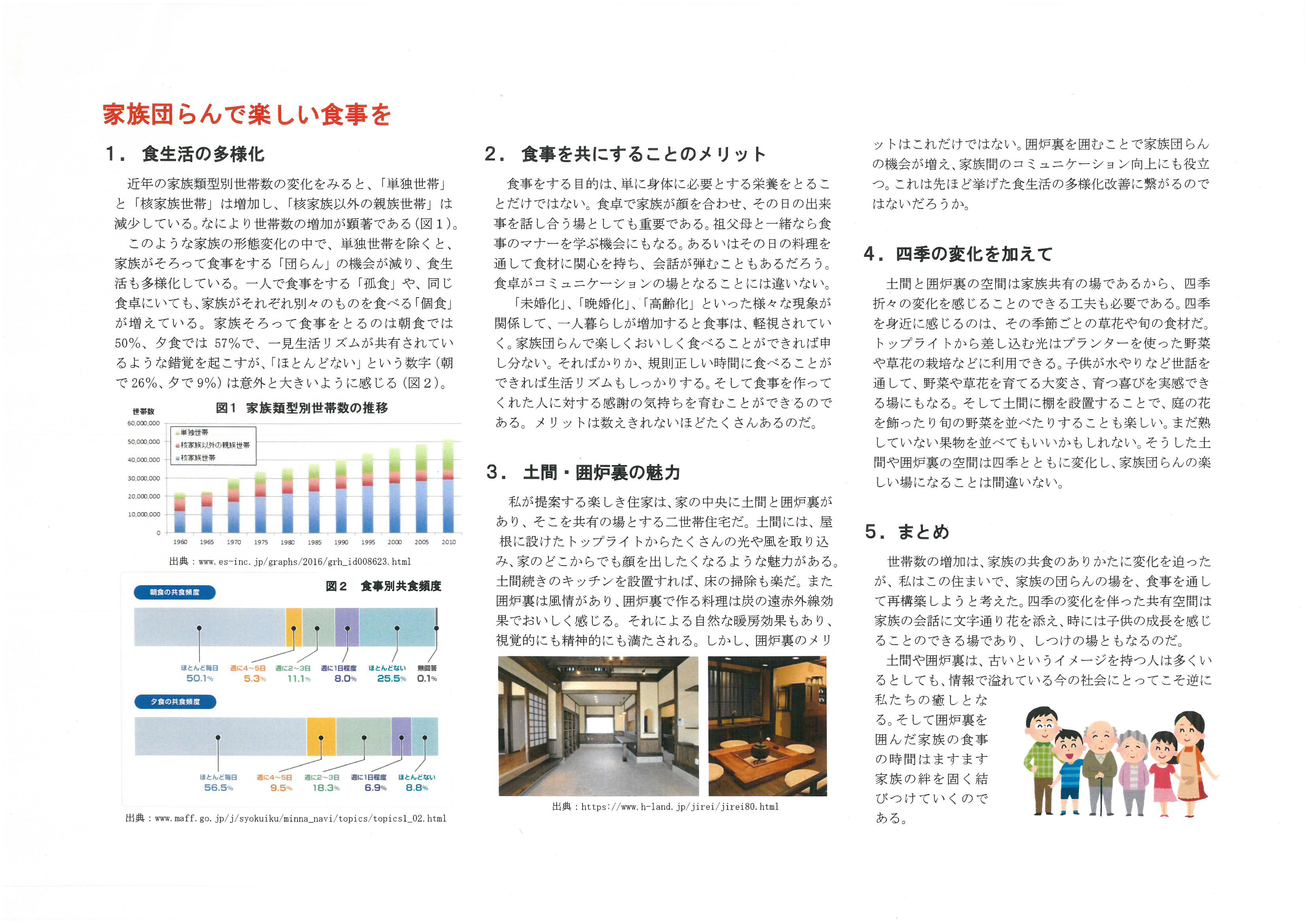 「家族団らんで楽しい食事を」は、「食生活の多様化」について丁寧に資料調査を行っています。調査の結果、共食の割合は、朝食で約50%、夕食で約56%です。つまり、「共食」ではなく「個食」が約半数を占めることになります。では、「共食」のメリットは何でしょう。その食事の中での会話、食事のマナーを知るのも「共食」の良い点ですね。何よりも、食事において「感謝」の心をもった会話が重要と指摘します。応募者は、家族の食事空間に「土間」や「囲炉裏」の提案をしている。家族で囲炉裏を囲み、会話が生まれ、旬の食材で季節を感じます。昨今希薄になりつつある「家族関係の再構築」を「囲炉裏」を囲んだ団らんからつくる提案です。