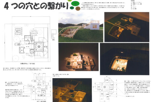 「4つの穴とのつながり」は、建物1階程度のレベル差のある敷地を設定し、建物の大部分は地下に設け、屋上を緑化してランドスケープ化しています。さらに、ドライエリア形式の4つの庭を設け、それらの庭に面して各部屋を配置するという地上1階地下2階建ての非常に特徴的な作品です。ファミリー用の広いダイニングと、大きな中庭内に大人数で食事ができるスペースが設けられ、生活の各場面に応じた食事空間が提案されています。大きな中庭への階段の狭さやアクセスなどについての検討が望まれますが、空間的に魅力的な提案です。