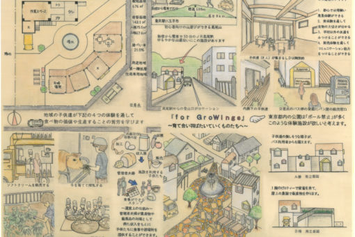 「for GroWings~育て合い羽ばたいていくものたちへ~」は、地域の子供たちに農作物や家畜等を育て、食料を作る体験の場をつくるとともに、家庭や学校以外の子供たちの集いの場を設け、みんなで食事ができる施設を提案しています。要求条件を、「子供たちが夢をはぐくみ、人間関係が実現できる、施設建築の提案」と解釈し、農作物の生産、加工、販売など管理運営についての提案と、きめ細かなドウローイングとプレゼンテーションが評価された作品です。