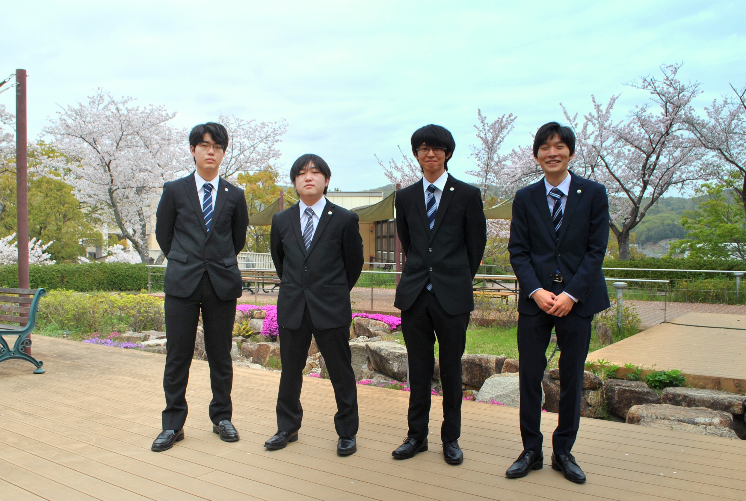 工学部スマートシステム学科 伍賀です。 先月、工学部スマートシステム学科を卒業し、大学院工学研究科電子・電気工学専攻に進学した4名の学生が、4/3(土)の入学式に参加しました。今年度の入学式は、密を避けるために、午前の部・午後の部と別れて開催されましたが、電子・電気工学専攻は午前の部でした。今年の桜は開花が早く、すでに散り掛けになっていますが、進学した菅原研究室の猪原基周さん、大本智也さん、香川研究室の北村蘭丸さん、林良成さんで工学部棟前の陽だまり広場で、記念写真を撮りました。