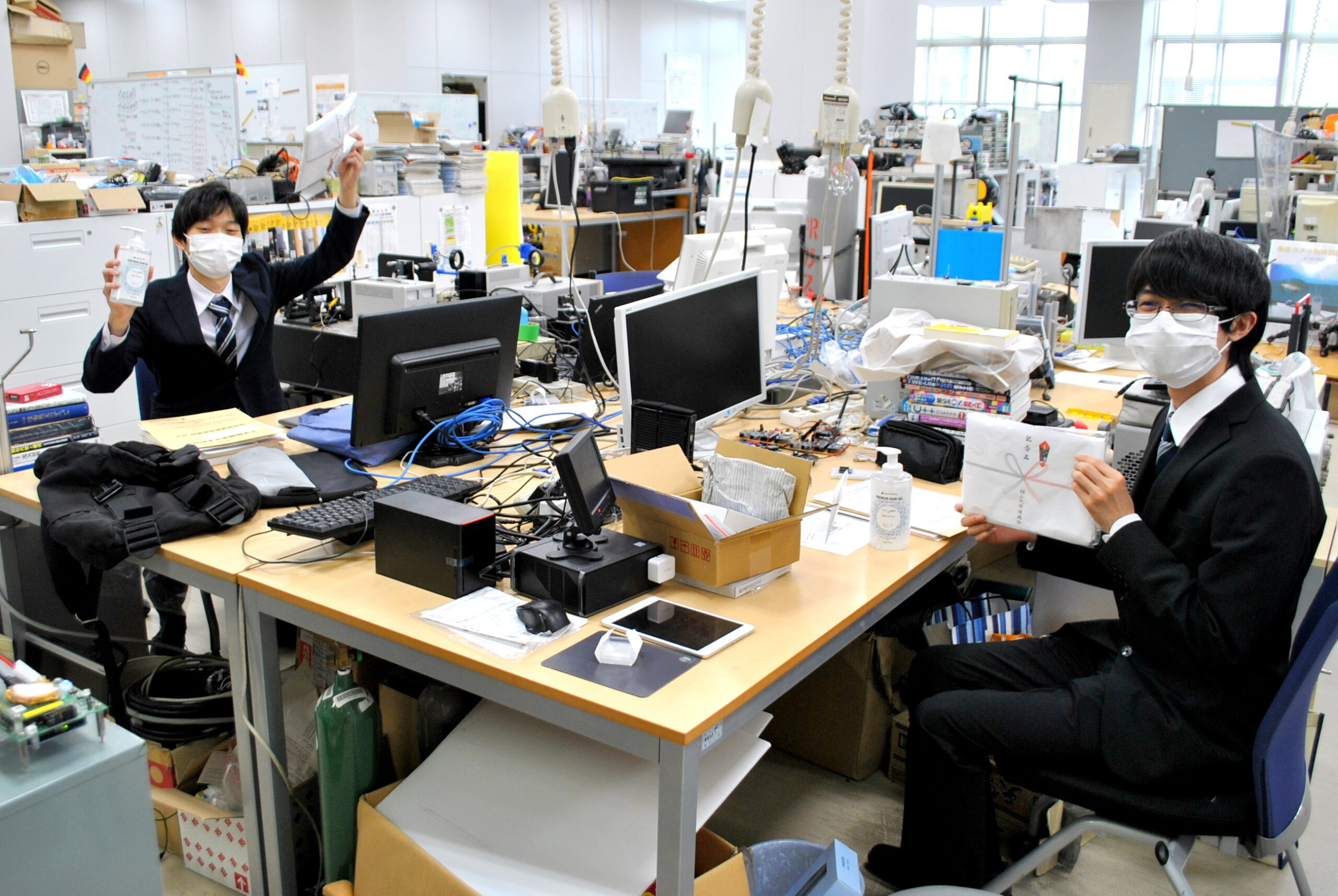 今回の入学式では、新型コロナ感染症のため、学生にマスクと消毒用ジェルが配布されました(上の写真で北村さん・林さんが持ってます)。昨今の社会状況の下、なにかと制限を受けることも多いですが、これからの社会を支え、日本の技術を担う研究者として成長していくことを彼らに期待したいです。みなさん頑張りましょう!