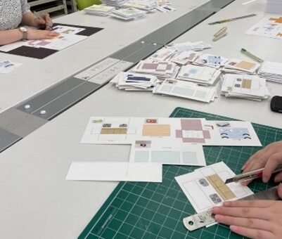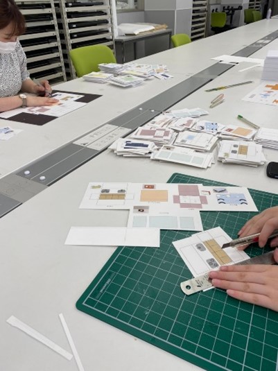 今週の活動では、家具を製作するチームや壁や屋根を作るチームに分かれて、参加者に事前送付する模型キットの準備をしました。
