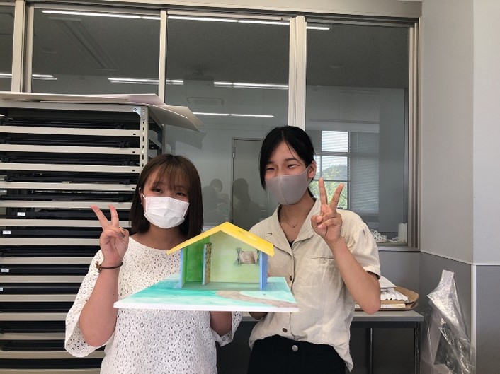 びんご建築女子「こども模型教室」運営メンバーの建築学科1年河瀬と松尾と山本です。