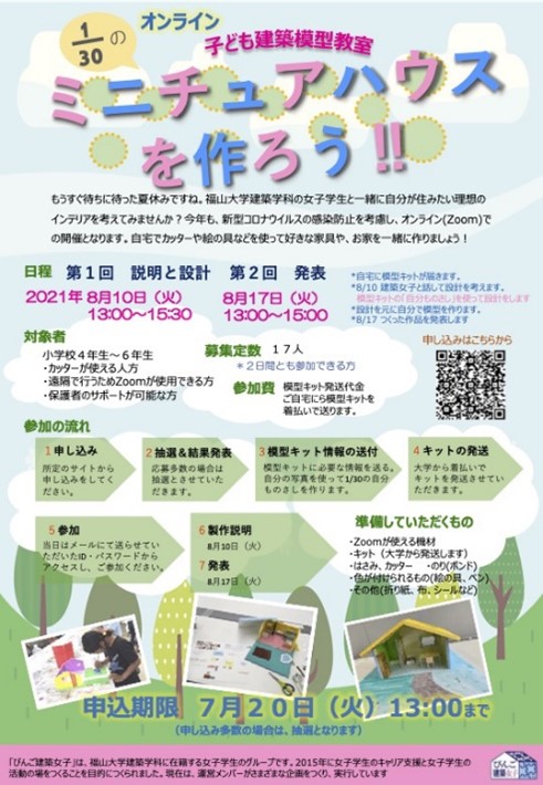 コロナ禍ということもあり遠隔という形での子ども模型教室の開催となりますが、自分がイメージする好きな物や空間を形にするという楽しさや、その経験から少しでも建築に興味を持ってもらうことができたらなと思っております。