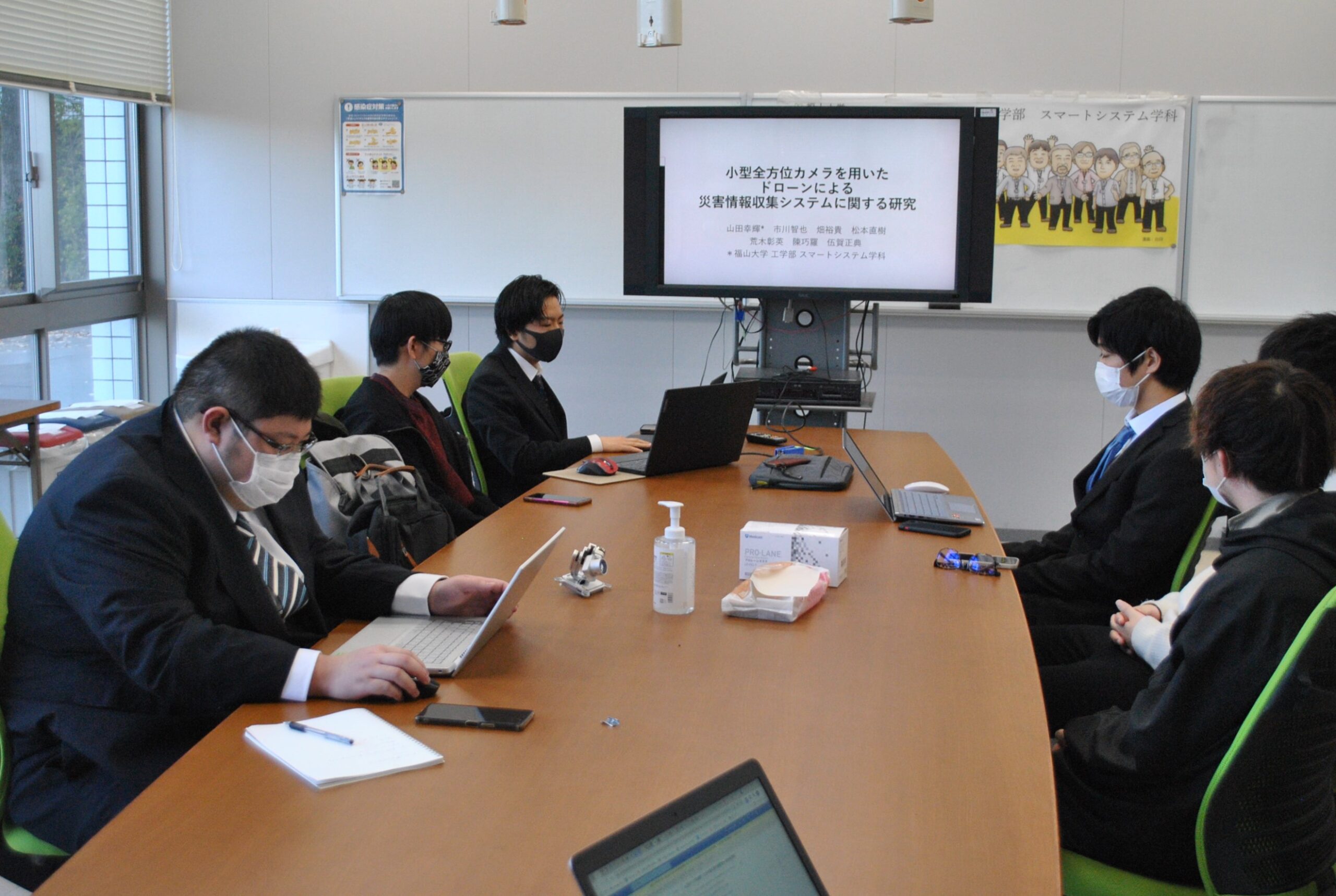 スマートシステム学科からは6件の発表があり、そのうちの5件は学生が登壇し発表を行いました。その内容は、4年生の卒研生の発表3件、2年生のドローンチームの研究発表1件、1年生は教養ゼミで取り組んできたグループワークの発表1件です。多くの学生にとっては今回が初めての学会発表ということで、緊張した面持ちでの参加、学会前にはプレゼンテーション資料を作成したり、発表練習を行ったりとなかなか大変な日々だったようです。各々の発表を見ていきたいと思います。
