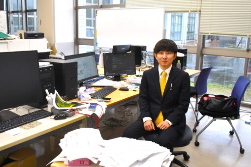 鳥谷部君は菅原教授の電子回路研究室で、卒業研究ではパワー半導体の電流検出回路の改良に関する研究に打ち込んできました。大学院に進学し、自身の研究をさらに深める!との意気込みを新たにしたそうです。彼のこれからのますますの活躍を期待しています。