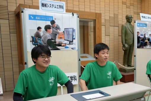 全体説明の会場では、入試や通学、一人暮らしに関する相談を受け付けるだけでなく、各学科の教育内容についての相談もありました。機械システム工学科の教員と3年生の在学生2名が質問に答えました。