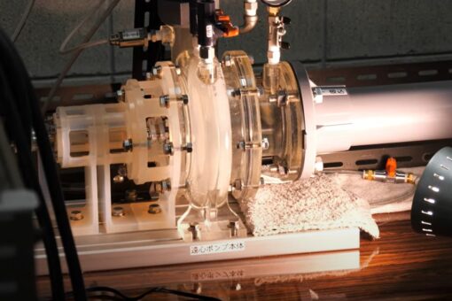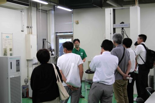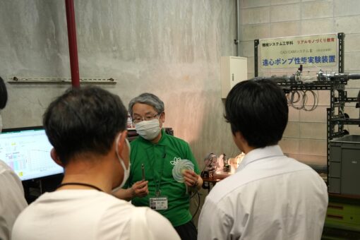 教育設備見学も行いました。「リアルものづくり教育」で実施する、遠心ポンプの性能試験装置を見学し、実際に流量の測定を行いました。設計・製作・評価まで一貫した授業で、ものづくりをリアルに体感できます。