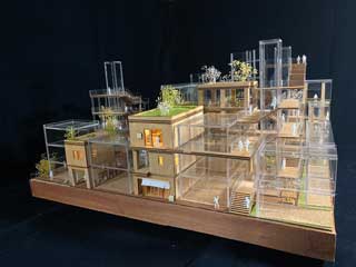 図面だけではなく、模型もしっかり作っている。広島県三次市は広島県北部に位置し、三好駅は山陽と山陰とつながる3路線の結節点であったが、利用者の減少により2018年に三好駅が廃線となった。しかし、線路と駅は残され、それとともに嘗て三江線を利用した住民たちの記憶のなかにも残されている。道上君は、鉄道と駅が地域を繋いできた歴史を重く受け止め、廃線となった鉄道路線と間隔が約2Km前後でつながる8つの駅を再利用し、住民たちが長く住み続けられるような設計提案を行った。各駅は周辺環境も各地域に求められる機能も異なるため、駅のつくり方のスタディを行った結果、共通のシステムによって形態と空間をつくり、各駅の敷地条件や駅周辺のニーズや特性にも適合するようなつくり方を考えた。その結果、一つの駅にすべての機能を設けるのではなく、その駅と地域の特徴によって必要な機能を設定し、その他の機能は他の駅を利用するという機能連結型駅の提案である。これらの多様性に対応する手法として、架線の架台として一般的に使われている鉄構造の門型フレームと車輛を思わせる木造を主体構造としたボックス状のチューブという2つの要素を用いる要素構成型のシステムを考えた。共通システムで駅の形や空間を作ることにより、各駅の関連性と連続性及び一体感を与えることができる。当作品は、廃線となった三江線と各駅の周辺状況を綿密に調査し、有触れた門型フレームとボックス状のチューブという2つだけの構成要素のみで、周辺環境が異なる各駅の多様な諸条件にも対応システムを構築した。その結果、各駅のチューブが積層する形態は美しく統一感もあり、しかも、それらの結節点には流動性と空間が生まれ、住民たちの記憶の継承とともに、今後も新たな生活の場として親しまれていく駅の可能性を感じることができる作品として評価したい。(大島)