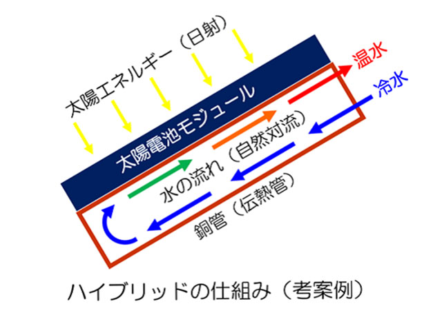 現在普及が進んでいる太陽光発電で、結晶シリコン系太陽電池モジュールでは強い日射しによってモジュールが高温になると出力が低下します。そこで本研究では,モジュールを間接的に水で冷却することによって出力の低下をできるだけ抑制し,同時に温度が上昇した水を給湯に利用する『ハイブリッド型太陽光・太陽熱併用システム』を構築して太陽エネルギー利用効率の向上を目指し、人と自然が共存・共栄する地球にやさしい技術の進展に貢献します。