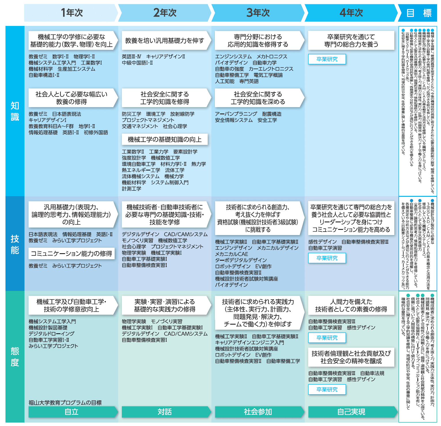 - 4.機械系エンジニアとして専門力だけではなく,会社組織の一員として他者の個性を尊重し,協調性やリーダーシップ,コミュニケーション能力を発揮できる人材を育成する。