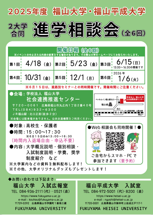 | 2025年度進学相談会を下記日時、場所で行います。申し込みは不要ですのでお気軽にご参加ください。 また、Web会議ソフト「Zoom」を使ったWeb進学相談会も同時開催します。(Web進学相談会は要予約) |