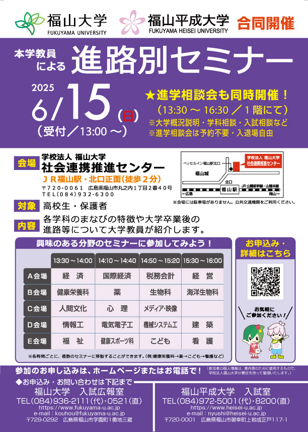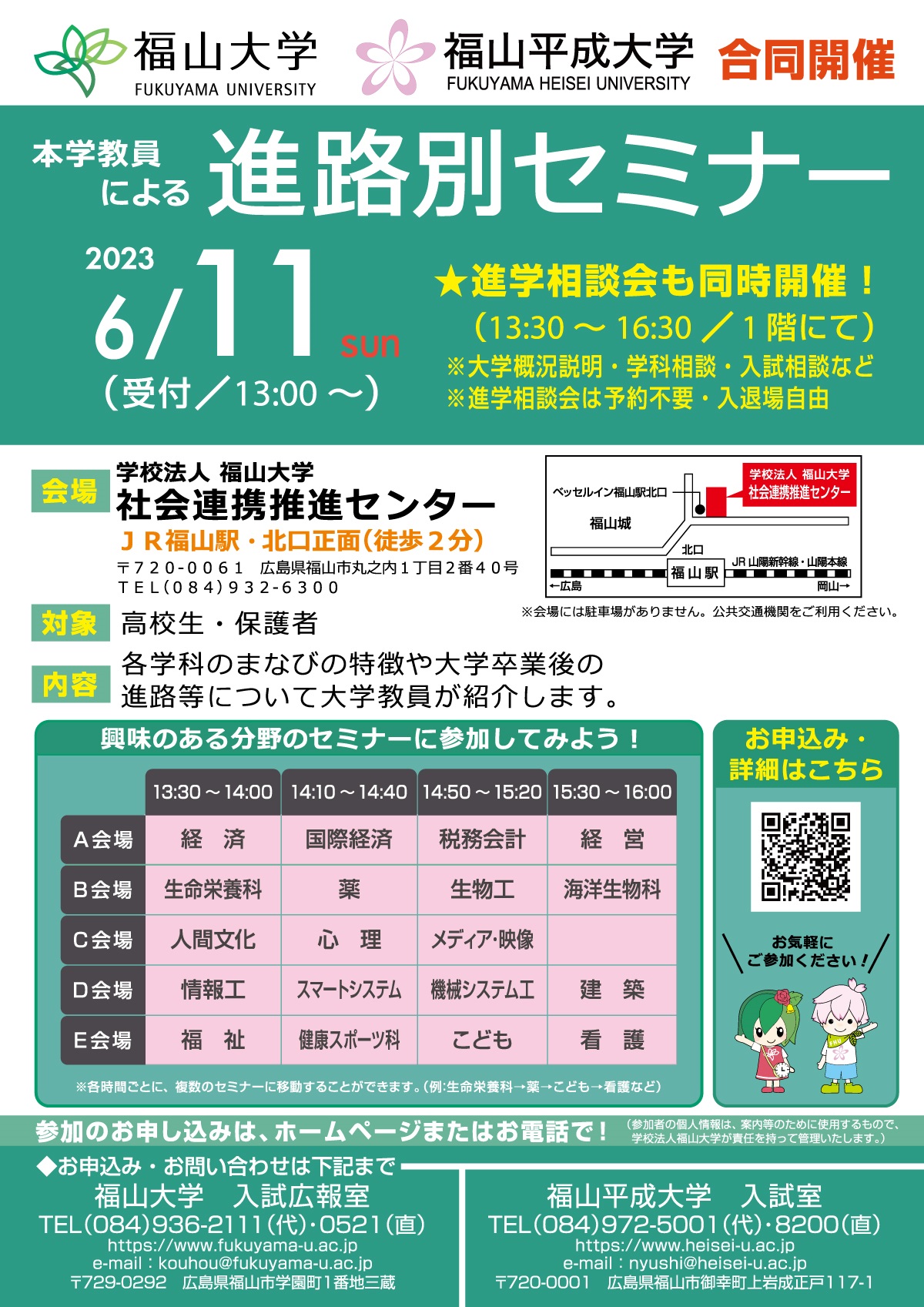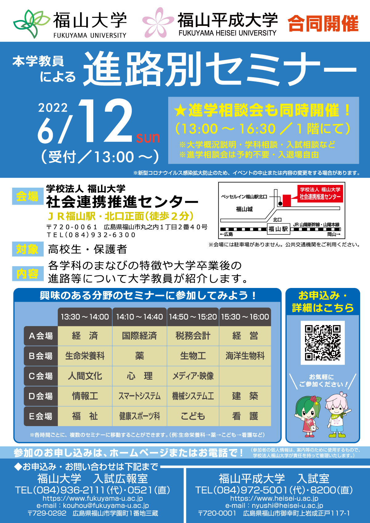 | 内容 | 各学科のまなびの特徴や大学卒業後の進路等について (福山平成大学と合同開催) |
