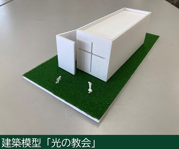 安藤忠雄が設計した「光の教会」の模型をつくります。学生がサポートしますので、ぜひ楽しくおしゃべりしながらつくってください!つくった建築模型はお持ち帰りいただけます。(80分程度でつくります)