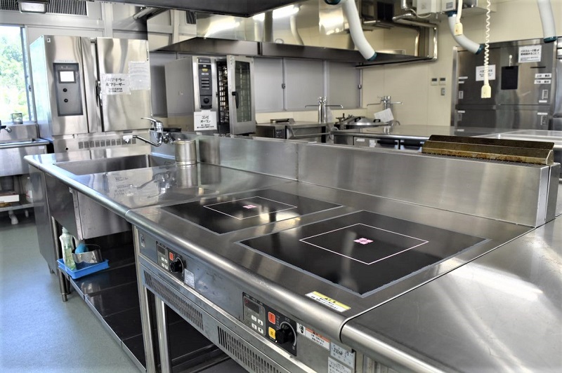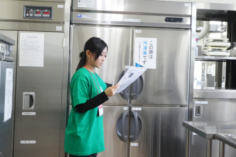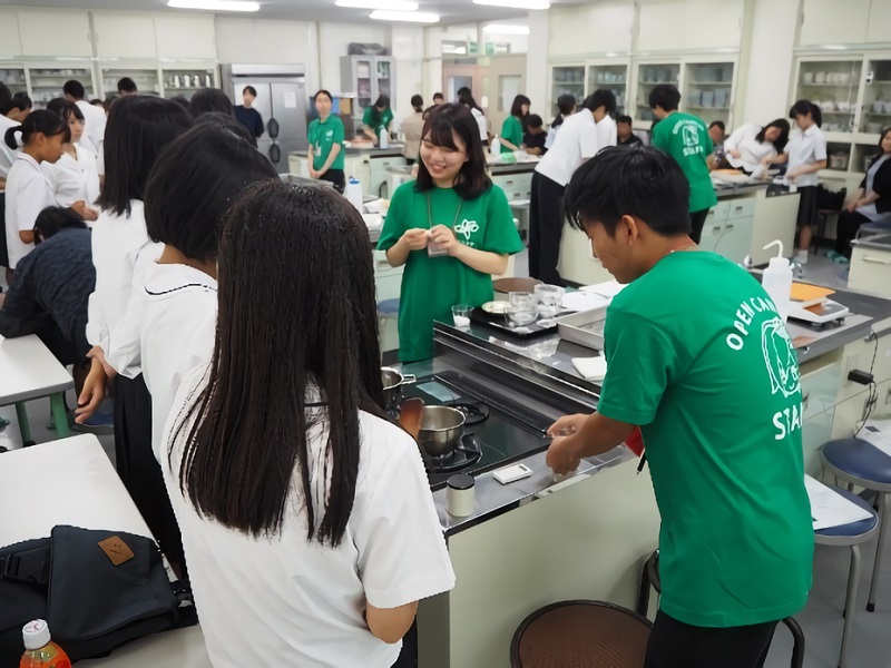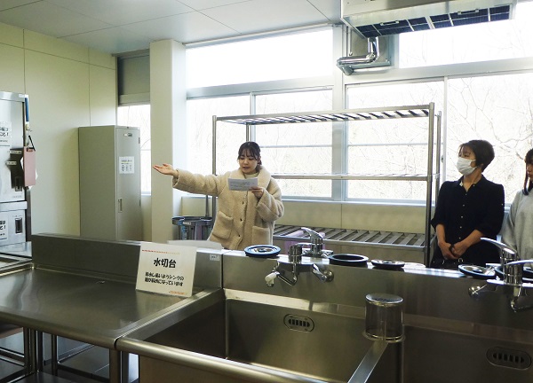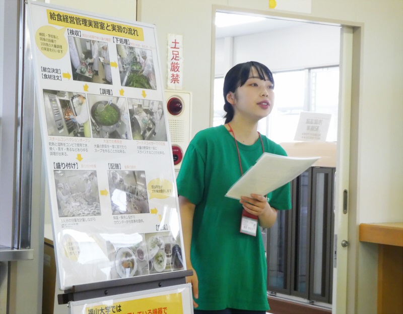 本学科の施設設備として、大量調理実習室をご案内して、管理栄養士過程の学びの一端を知っていただきます。学生がグループに分かれ、献立作成から大量調理を実施し、提供します。