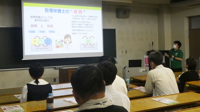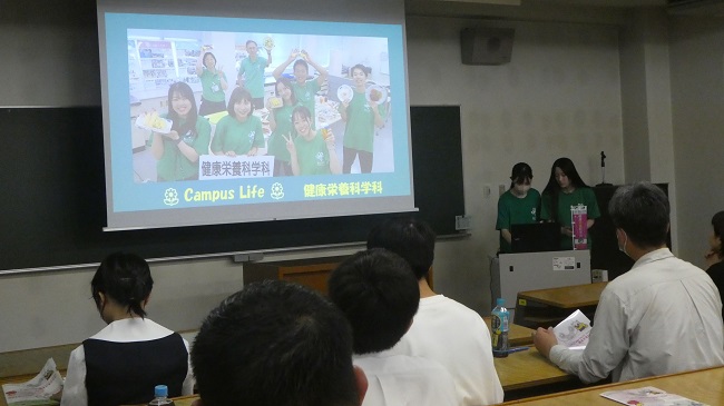 健康栄養科学科の管理栄養士過程を紹介します。また学生のキャンパスライフについて、在学生が説明させていただきます。本学科の施設設備として、大量調理実習室をご案内して、管理栄養士過程の学びの一端を知っていただきます。