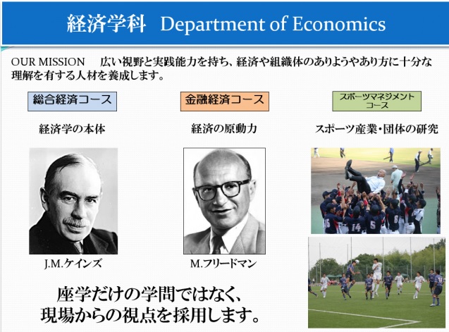 福山大学経済学部には経済学科、国際経済学科、税務会計学科の3つの学科があります。ここでは経済学部の概要と各学科の特徴を簡単に説明します。まずは簡単に経済学部の全体像をとらえてから模擬講義、研究体験、学生発表イベントに参加しよう。