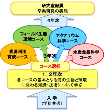 海洋系の学科は全国の大学にも多くありませんので、福山大学の海洋生物科学科でどのようなことを学べるのかよく分からない、という方もいらっしゃると思います。そこで、本学科のカリキュラムを簡単に紹介し、4年間で何が学べて、その学んだことを活かして将来どのような進路を目指すことができるのかについて説明します。