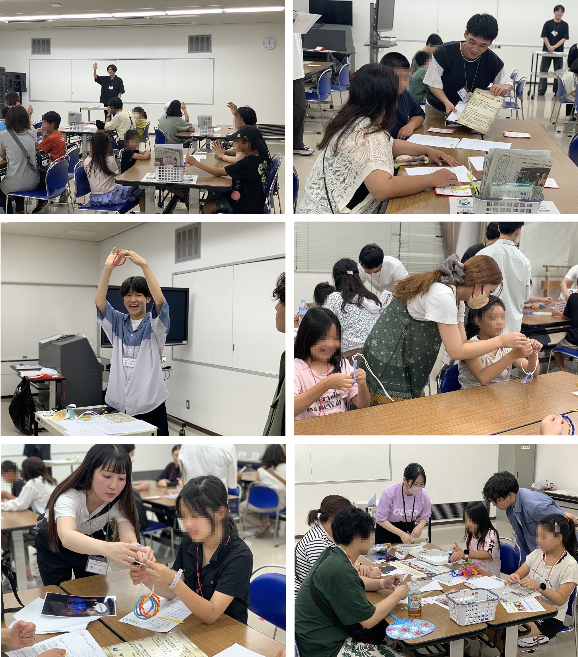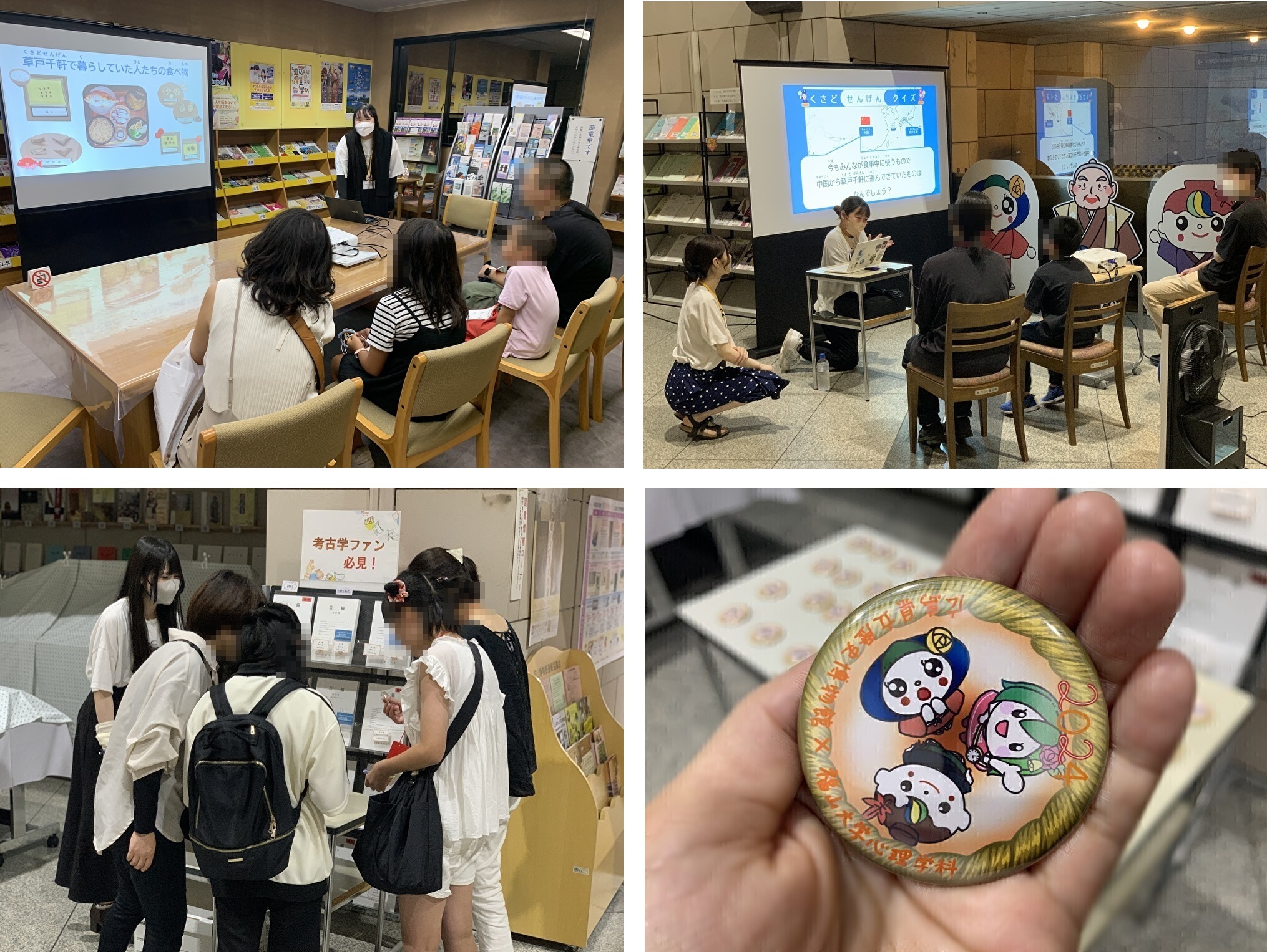 <歴史や心理学の話をする学生スタッフの様子(上段)と、お土産として作成した缶バッジを配る様子(下段)。>