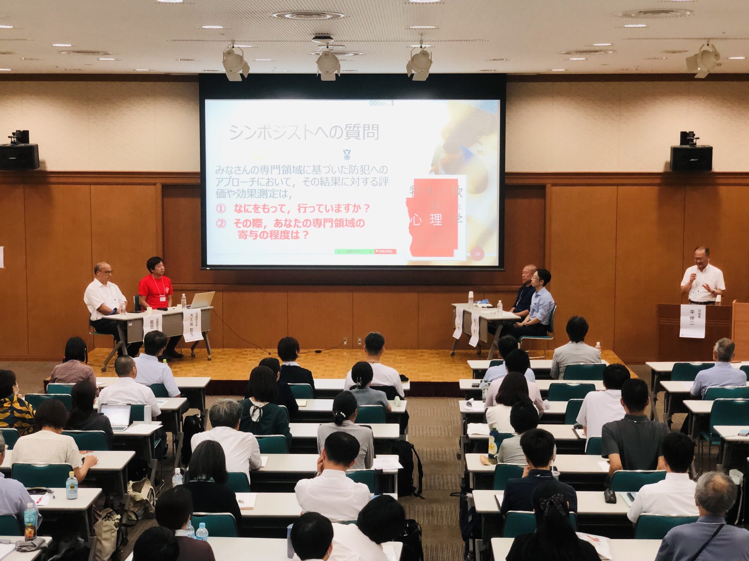 大会全体のテーマは「防犯からの地域活性」でした。これを受けた全体シンポジウムでは、防犯を通じて地域を活性化する取り組みをしている研究者や実務家の方からの話題提供があり、活発な意見交換がなされました。司会は本学の平伸二教授でした。
