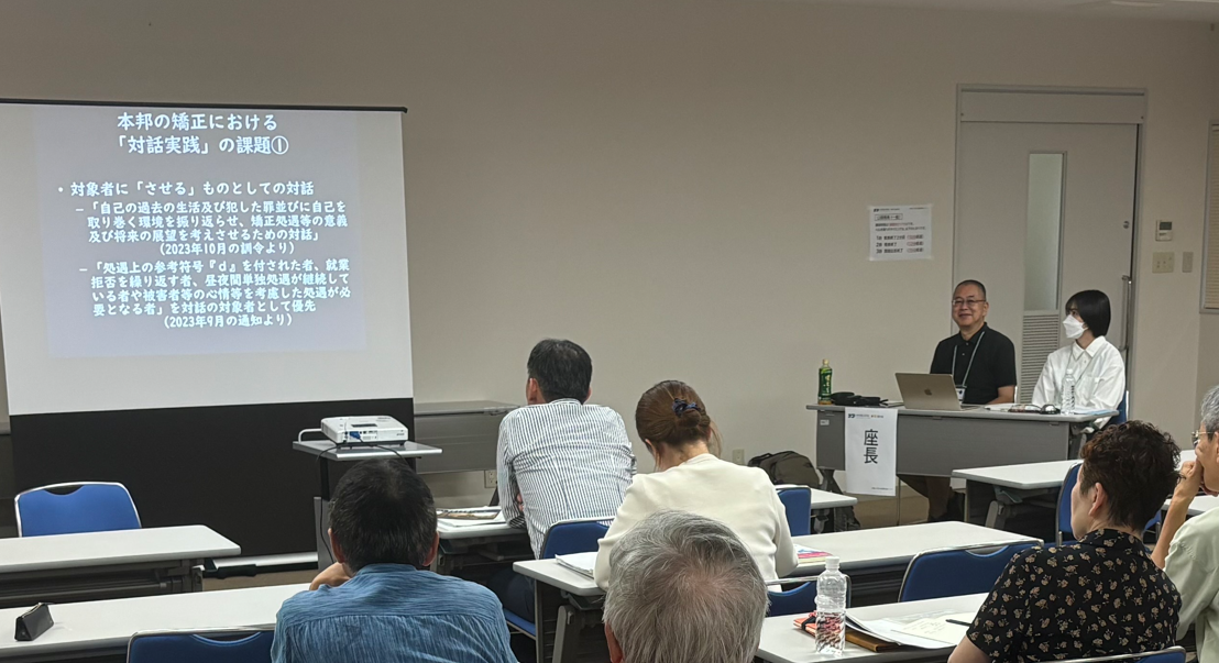 中島学教授も同じく大会企画シンポジウム「拘禁刑下における矯正指導の在り方」で企画・司会をし、刑法改正によって導入される「拘禁刑」と、それに伴う矯正指導の変化や支援者への影響をテーマに、対話モデルを中心に議論しました。