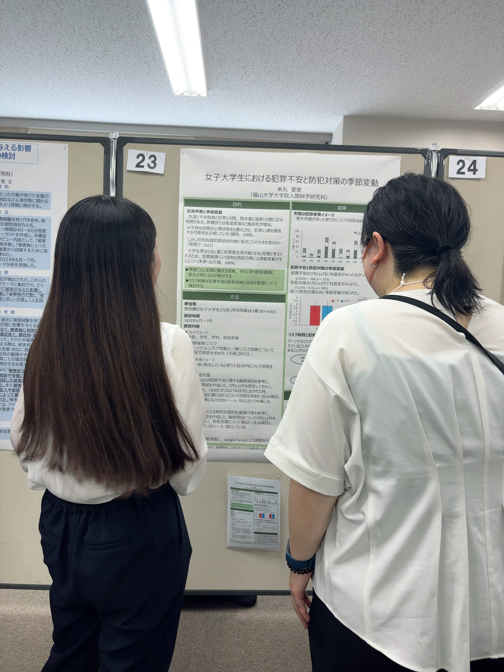 その他、学生では、平ゼミの大学院生の米丸愛里さんが、女子大生の犯罪不安が季節ごとに変わるのかをテーマにして行った調査の結果を報告しました。