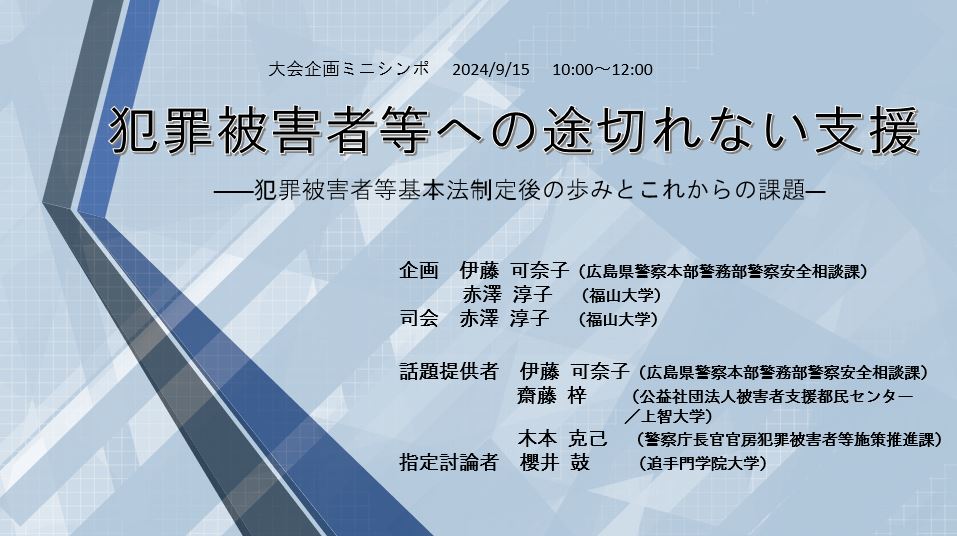 まず教員の方では、赤澤淳子教授は、大会企画シンポジウム「犯罪被害者等への途切れない支援」で企画・司会をし、犯罪被害者支援の現場と国の施策に関わる専門家を招き、被害者が平穏な生活を取り戻すための支援の継続と課題について議論しました。