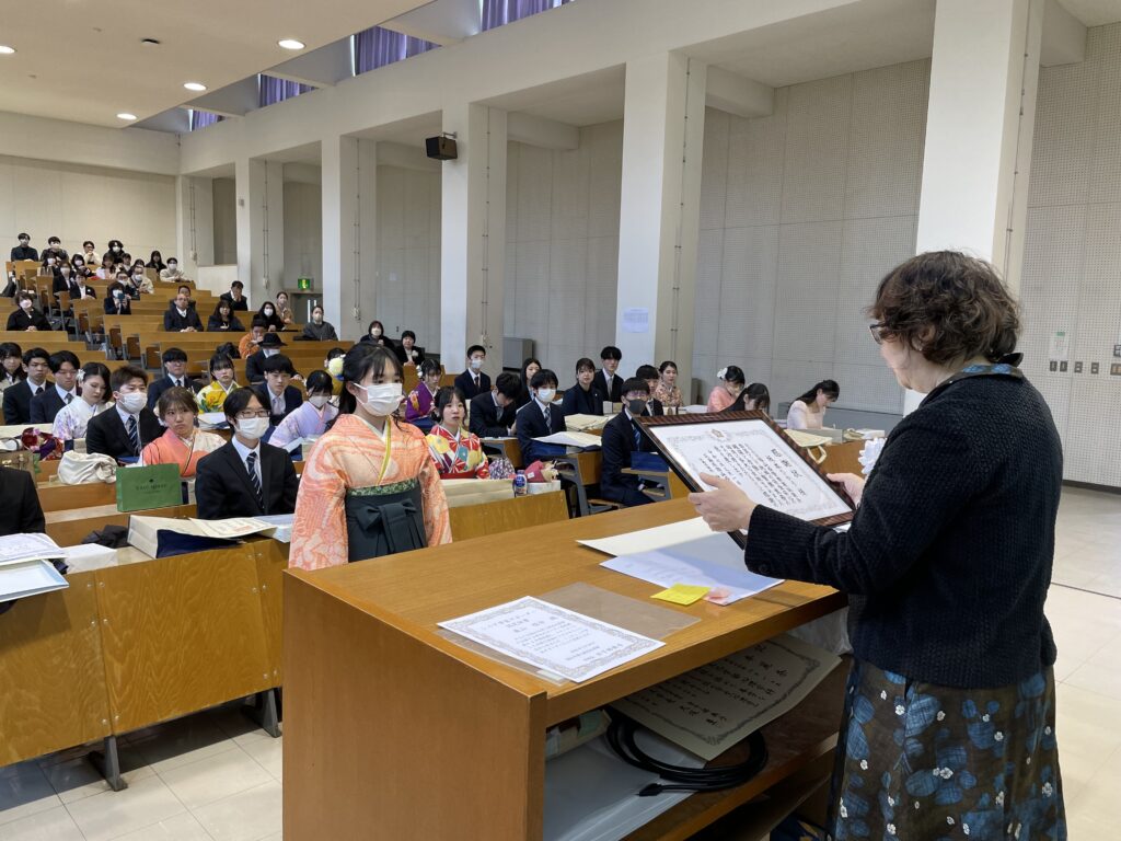 学位授与式では心理学科の学生総代を黒籔妃夏さん(矯正心理学研究室)、心理科学研究科の総代を塩田沙月さん(医療心理学研究室)が務めました。黒藪さんは2年次生、3年次生の時にも表彰されています。