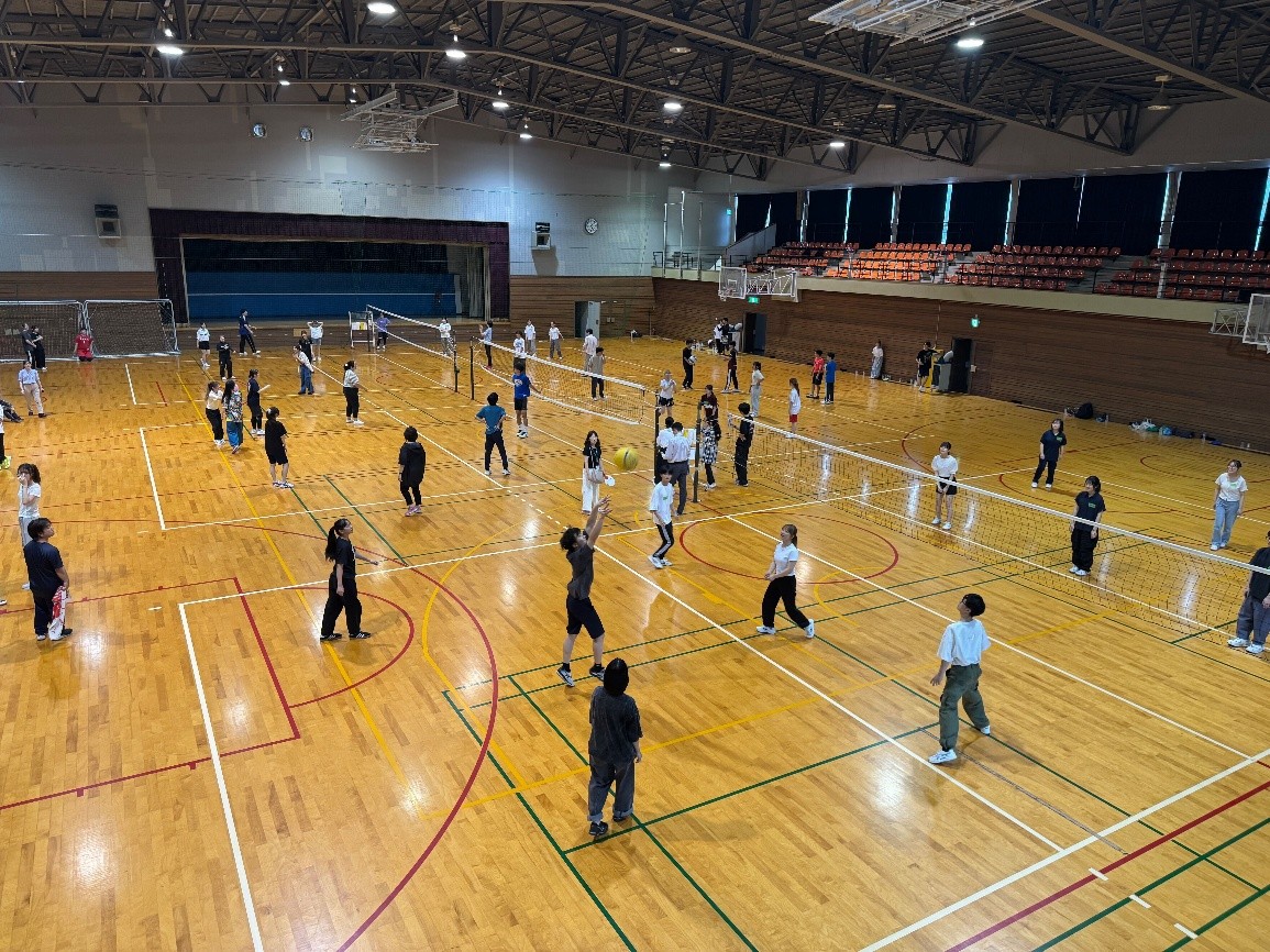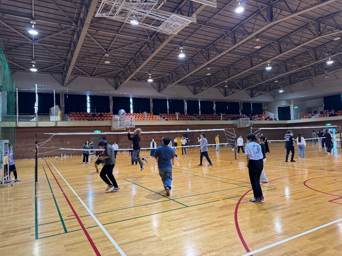 ソフトバレーでは、1,2年生男女混合で12チームに分かれて、試合をおこないました。初対面のメンバー同士でしたが、試合では声をかけあい、楽しくプレーができました。