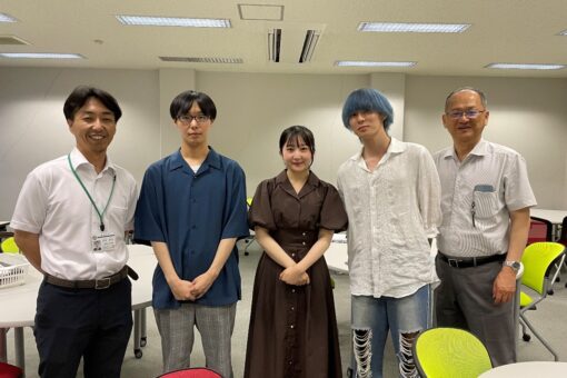 最後に、平 伸二教授(犯罪心理学研究室)、寺田和永准教授(教育臨床心理学研究室)と協力してくれた大学院生とで集合写真を撮りました。大学院生は、写真左から人間科学研究科2年生の濵﨑省吾さん(健康心理学研究室)、米丸愛里さん(犯罪心理学研究室)、1年生の島田 壮さん(犯罪心理学研究室)です。