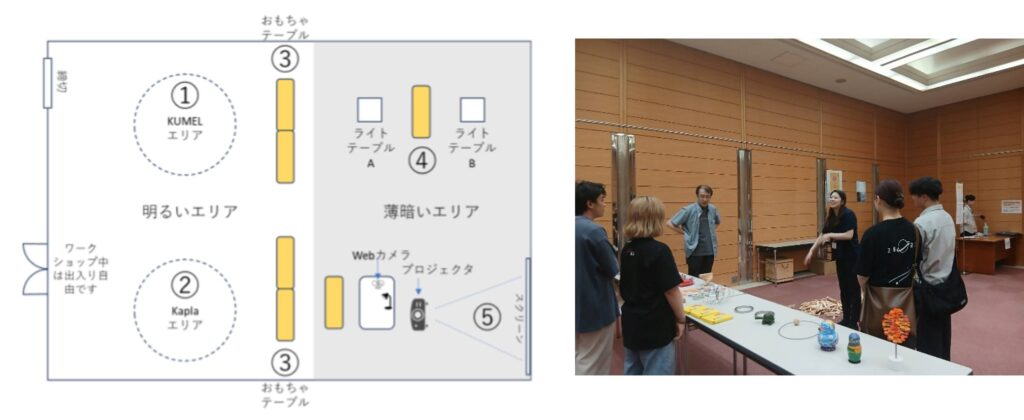 ファミリー・アート教室「カタチを組む/ヒカリで遊ぶ」で、深田先生は以下のような5つのコーナーを企画されました。そして、教室開始前に、深田先生より学生に各コーナーの説明があり、学生が一人ずつコーナーを担当することになりました。