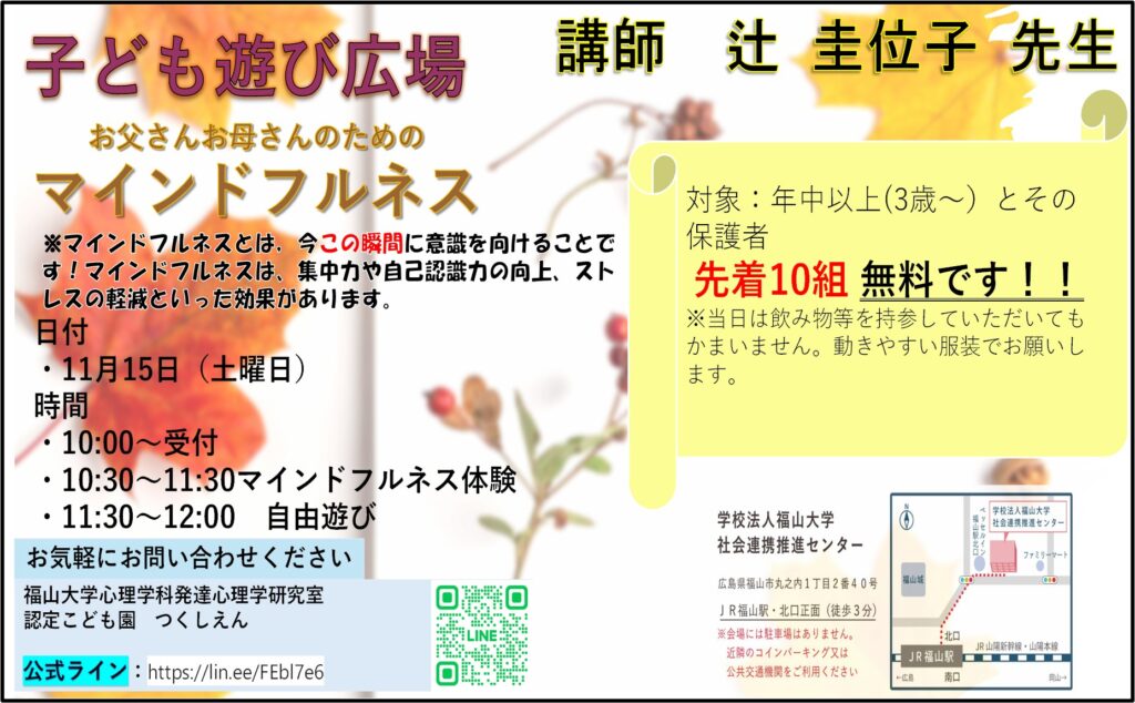 2025年度は、11月15日(土)、12月6日(土)、1月10日(土)、2月14日(土)の年間4回の活動を実施する予定です。11月15日のポスターは既に完成しており、マインドフルネスを実施します。親のストレスを軽減するための活動で、親がマインドフルネスに取り組んでいる間、学生は子ども達と遊びます。実は、マインドフルネスの講師は、福山大学大学院人間学研究科の修了生で、公認心理師の資格を取得し、学校でスクールカウンセラーをしたり、病院で発達検査を実施したりするなど、地域で活躍しています。修了生を子ども遊び広場の講師としてお迎えできることも、非常に喜ばしいことだと思っています。
