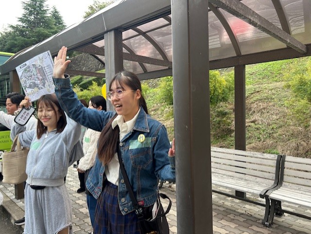 <バス停で子どもたちを迎え,グループごとに自己紹介をしました>