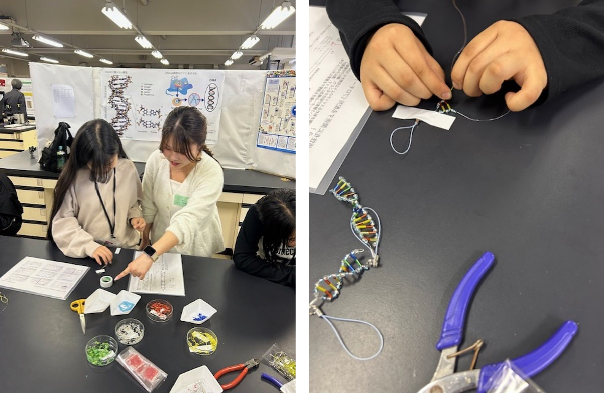 <生命工学部でのDNAビーズアクセサリー作成体験,食と健康の体験ゲームや海をテーマとしたポスター発表>