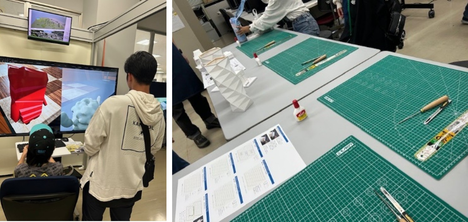 <工学部での大学生が作成したゲーム体験や和紙で作るランプシェード作成体験>