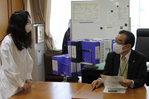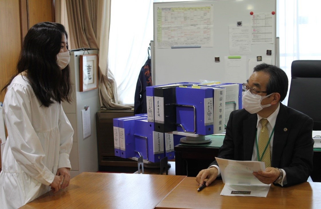 <2020年度の活動について大塚学長に報告する4年生の池本美穂さん>