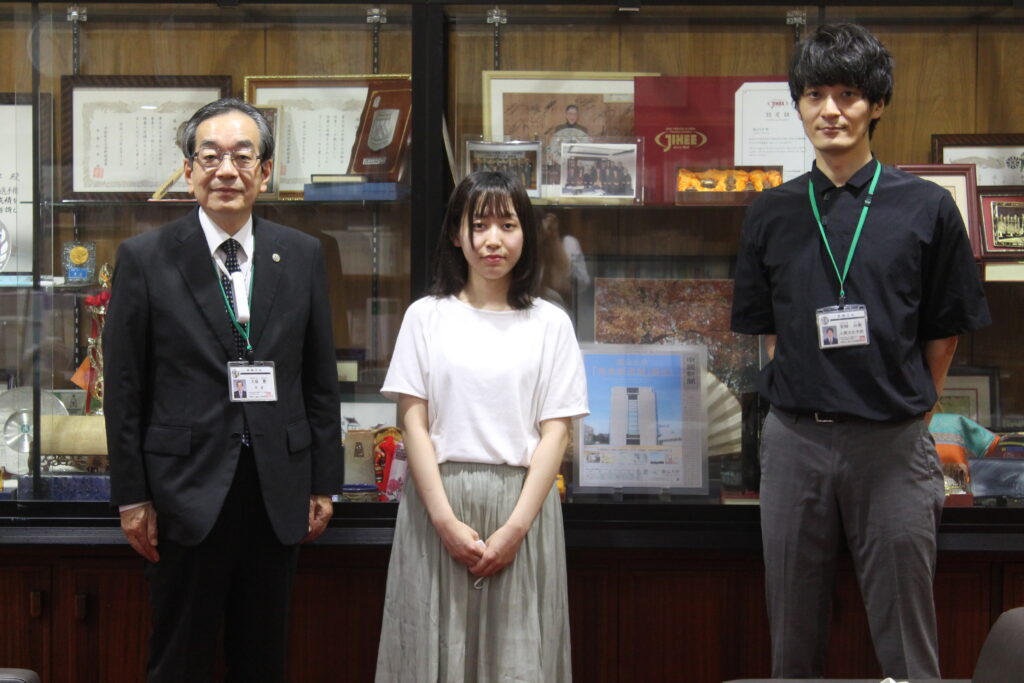 大石さんは、小松育英会の奨学生に認定された喜びと、その奨学金を生かして参加した広島県立歴史博物館との博学連携「草戸千軒お化け屋敷」の様子を大塚学長に報告しました。
