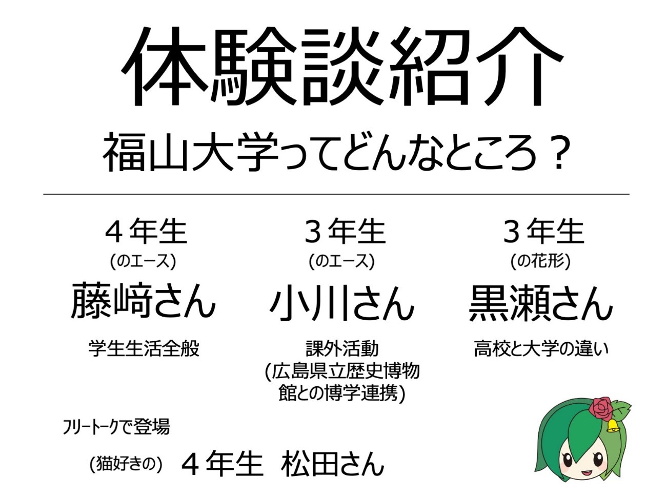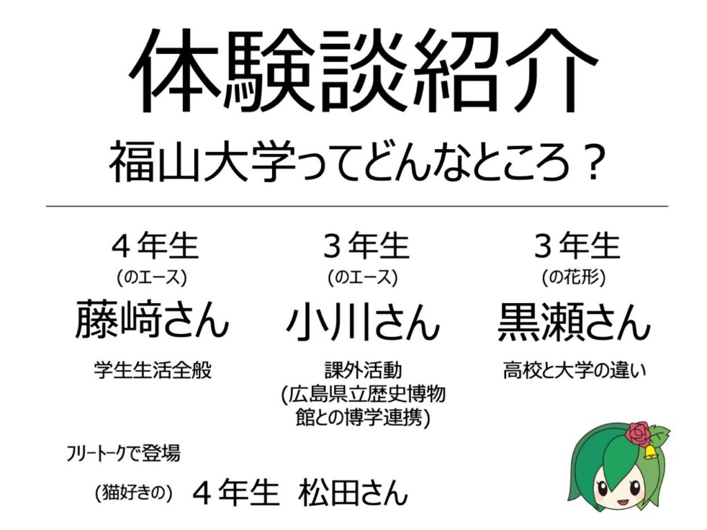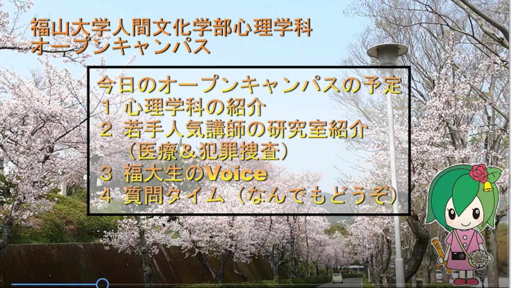 国家資格の公認心理師についての説明もありました。公認心理師は様々な場面で活躍することが期待されていますが、心理学科では色々な取り組みをしていますので、ホームページも見てみてくださいね(福山大学人間文化学部心理学科のページはこちらです)。