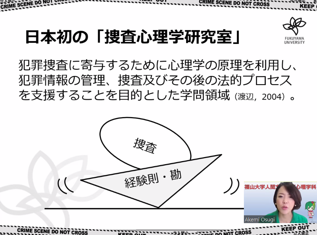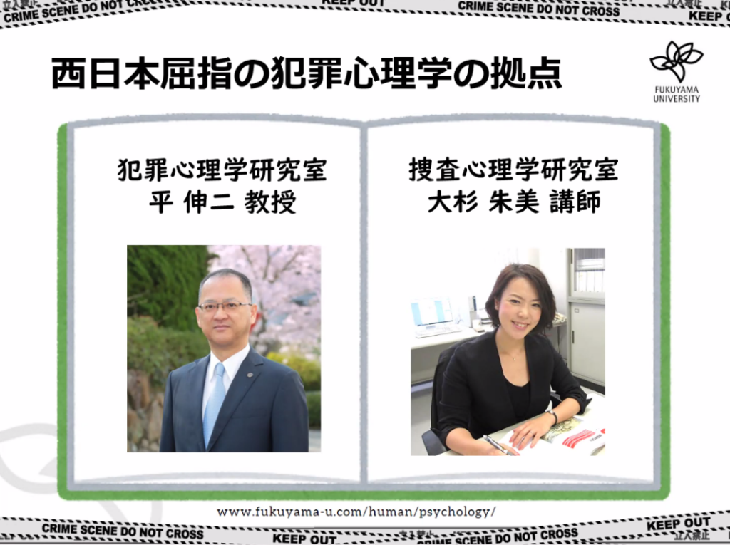 また、心理学科では科捜研に勤めた2名の実務経験者から犯罪心理学・捜査心理学を学べるのがすごいところ(平伸二教授の犯罪心理学研究室と大杉朱美講師の捜査心理学研究室)です!!