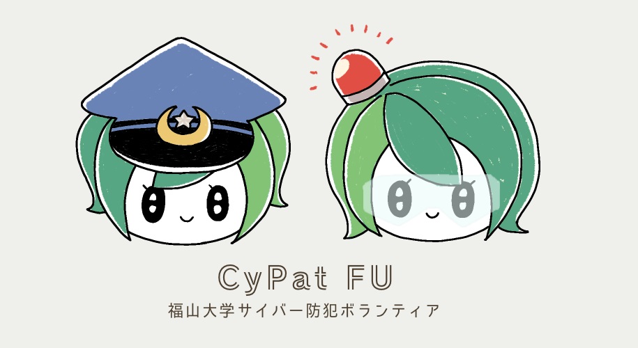 福山大学サイバー防犯ボランティア CyPat FU(さいぱっとえふゆー)です!(※ Cybercrime Prevention Activity Team Fukuyama University(サイバー犯罪防止活動チーム、福山大学)の頭文字を取っています。)
