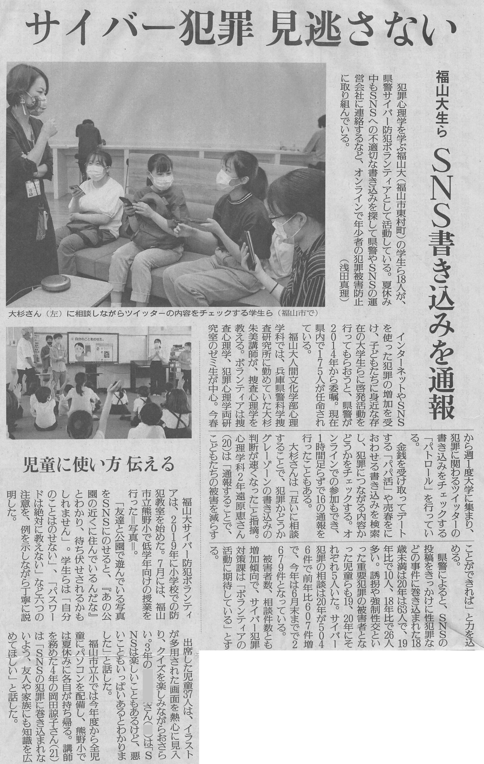 サイバー犯罪を見逃さないぞ!という熱い気持ちで、夏季休業中も毎週の活動を継続した私たちのことを、浅田様が素敵な記事にしてくださいました。8月20日(金)、読売新聞備後版に掲載していただいています(※ 記事のブログへの掲載については、利用の承諾を得ています)。
