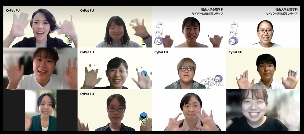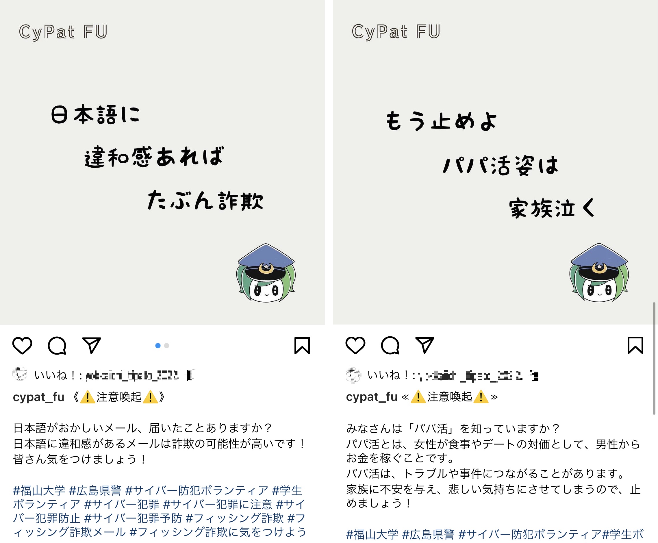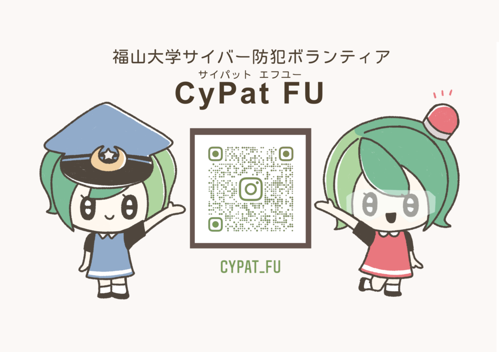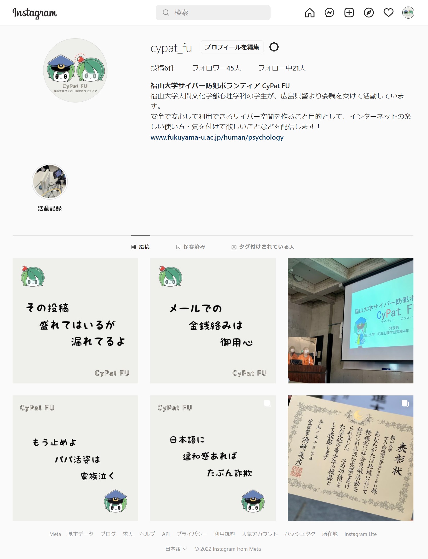 CyPat FU(Cybercrime Prevention Activity Team Fukuyama University: さいぱっとえふゆー)は、心理学科の犯罪心理学研究室(平伸二教授ゼミ)と捜査心理学研究室(大杉ゼミ)の学生を中心に、広島県警から委嘱を受けて活動しています。 COVID-19の影響で再び対面での実施が難しくなった現在も、毎週オンラインにて活動を続け、犯罪被害防止のための教育活動や広報・啓発活動、サイバーパトロールに取り組んでいますが、この度、サイバー犯罪被害防止のための広報・啓発活動の一環として、近年利用者が増加しているインスタグラムでCyPatのアカウントを開設しました!