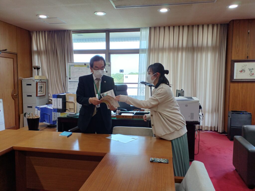 <報告書を学長に進呈している赤枝さん>