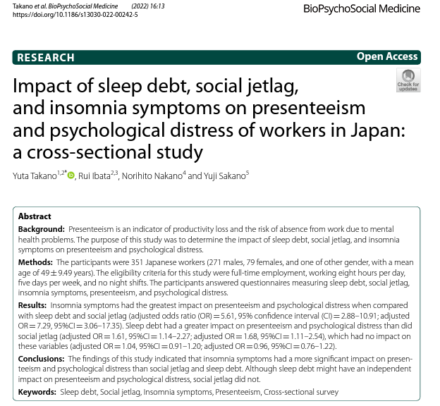 この度、私たち研究グループが行った睡眠の問題と日中のパフォーマンスおよび心理的ストレスの関連を調べた研究論文が、国際誌「BioPsychoSocial Medicine」に採択されました。本日はその研究について、ご紹介いたします。