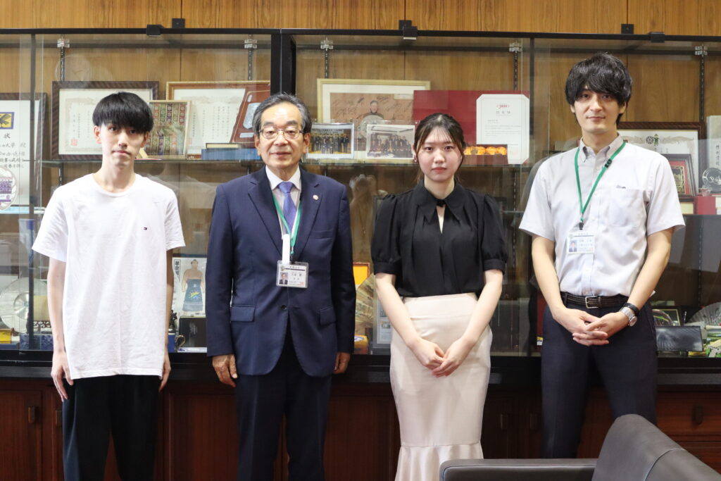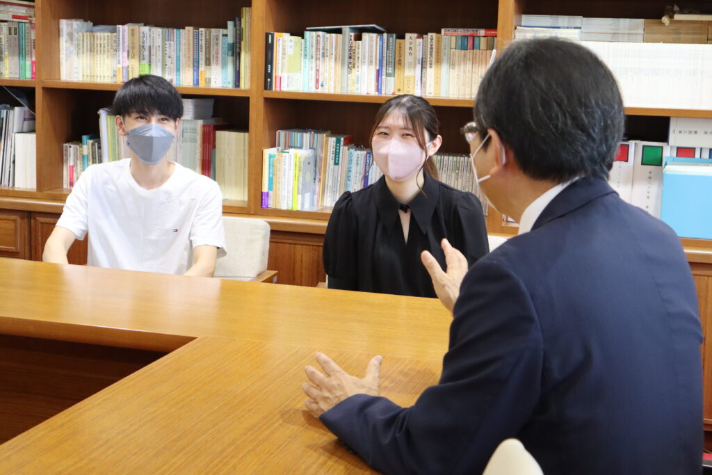 久原さんと小川さんは、7月上旬に学長室を訪問し、給付奨学生に認定された喜びと、その奨学金をどのように生かしているか、自身の卒業研究、そして将来の目標等について大塚学長に説明しました。