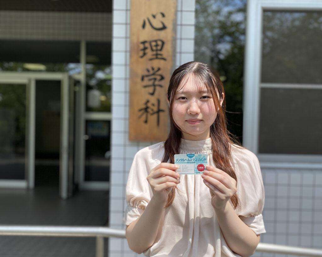 <久原さんが手に持っているのは「メンタルヘルス・マネジメント検定」の合格証です。>