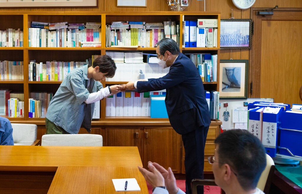 今回の映像配信に関わったのはメディア・映像学科の3年生と4年生です。広島県ドローン協会の技術顧問であり、メディア・映像学科の『メディア発展実習』、大学共通科目の『ドローンで撮る地域の魅力』を非常勤で担当の岡田秀一非常勤講師とともに、学長室での感謝状の伝達と、今回の報告に行きました。