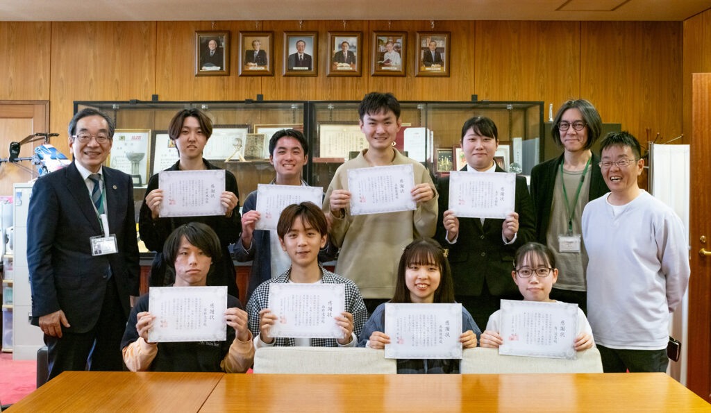 学長から一言:過日府中市で開催された「第四回釈迦院ドローンレース」での活躍が認められ、広島県ドローン協会から感謝状を贈られたメディア・映像学科の3年生と4年生の皆さん、おめでとうございます! 大学で培ったモノを作り、見せ、伝える知識や技術を存分に発揮した結果でしょう。これから益々の活躍を祈ります。