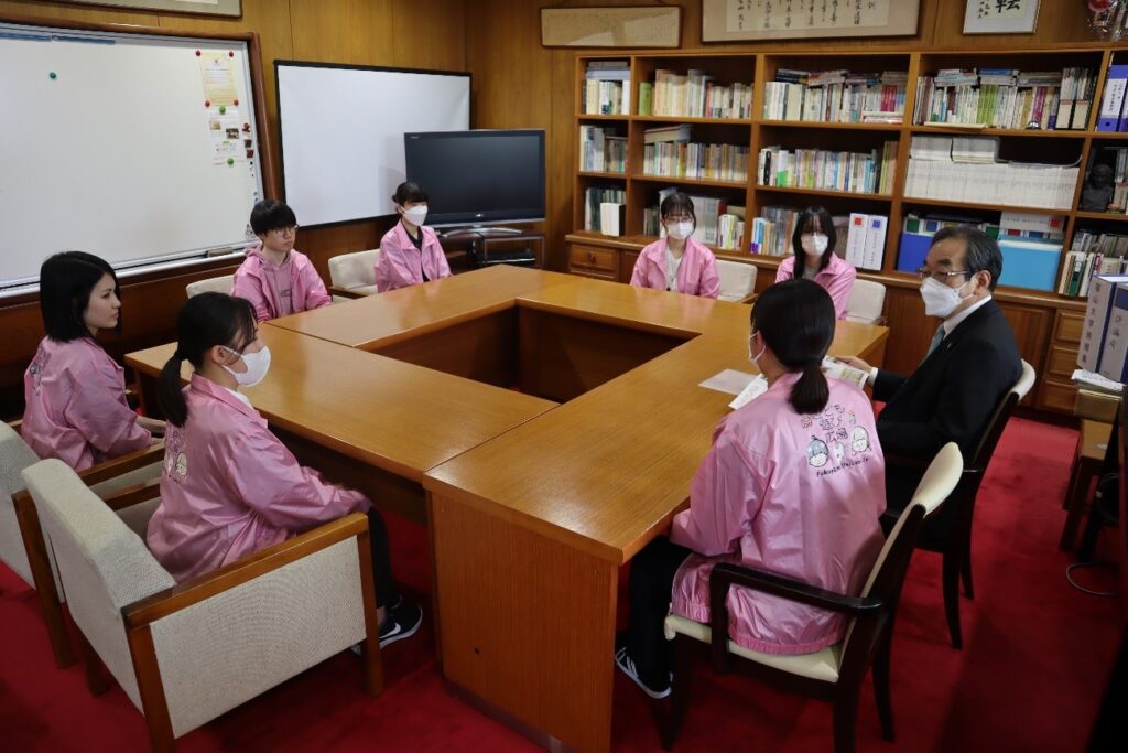 心理学科の赤澤です。2024年5月30日に、心理学科発達心理学研究室の4年生7名が学長室を訪問し、大塚学長に2023年度の子育てステーションについて報告しました。