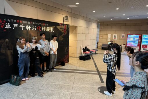 学長から一言:今や福山駅前の県立歴史博物館での夏の風物詩になった感のある「草戸千軒お化け屋敷」に今年も心理学科の有志が取り組んでいます。開催期間中だけでなく、企画・構想段階から衣装や小道具の準備など長い準備期間があったのですね。学芸員の専門家と協力して、来場者をゾクゾクさせる「良いお化け」になって下さい。